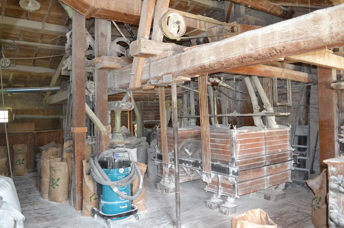 Un moulin qui a une âmePuis l’impressionnante mécanique se met en branle, jusqu’au plancher recouvert de farine, qui vibre.