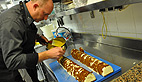 À ses côtés Olivier réalise une terrine de foie gras cuit à basse température alors que Lisa confectionne les macarons qui viendront en décoration sur la buche chocolat blanc et mangue.