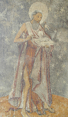 Un nimbe blanc entoure sa tête dans un décor peint d’étoiles. Saint-Jean Baptiste? Saint-Jacques insista de la main pour nous montrer quelque chose. Son manteau ? Sa peau de bête ? Entre ses pieds ? Une tête d’ours!