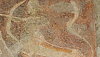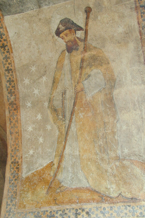 Il n’y a pas à s’y méprendre ! il s’agit en effet de saint Jean Baptiste du Désert, peint sur la voûte extérieure de l’église d’Audressein avec une peau d’ours sur le dos, un saint homme en effet, personne ne sera parti aussi loin dans le monde en compagnie de cet animal devenu légendaire, nous remercions d’un clin d’œil saint Jacques pour ce petit coup de bâton.
