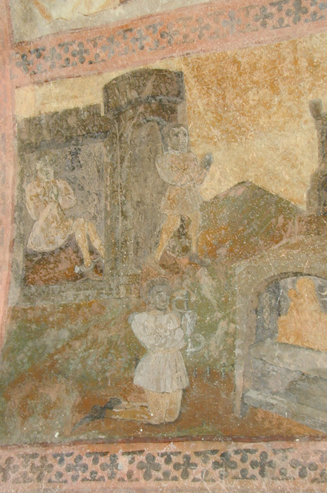 Nous nous approchons du premier arceau sous le porche extérieur de l’édifice sur lequel sont peints des ex-voto commandités par des familles en remerciements des miracles accomplis.