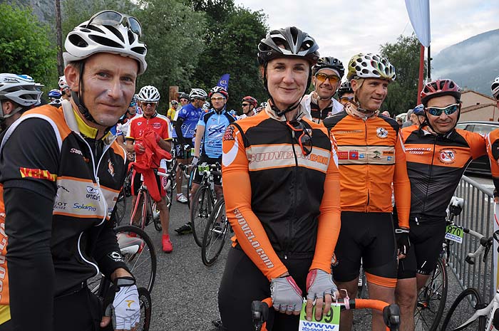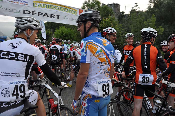 Parmi les rencontres sur la ligne de départ, Patrice venu spécialement de l'Ile Dieu en Vendée pour découvrir le département, cette équipe de Sud Vélo de Montpellier reconnaissable avec le logo «ne jetez plus vos déchets», un cyclo de Lourdes qui essaie de venir tous les ans, l'Ariégeois Christian Eychenne, à peine le Paris Bayonne achevé, enchaîne sur cette épreuve: «la fête de l'Ariégeoise ça ne se manque pas, c'est pour moi la 15ème et cette année j'arbore le maillot du Rotary International pour sensibiliser les gens pour la lutte contre la polio»