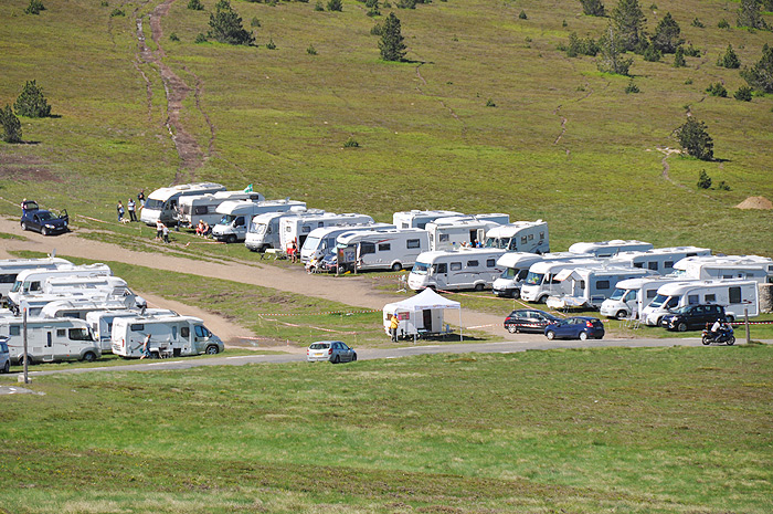 Tout au long de la montée vers le col, des espaces propreté régulièrement relevés, une fosse creusée pour les camping-cars, un commerçant ambulant qui apporte viennoiseries, journaux et fruits frais. Trois commerçants du village tiennent un stand: le boulanger, le restaurateur et le marchand de confiture. Et même un chapiteau pour des repas traiteur avec feu d’artifice!