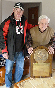 Après une longue séparation de 47 ans, les voilà tous les deux à nouveau réunis. Quelques larmes ont coulé. À côté de la photo de l’USCB117 saison 2000/2001, une autre va venir prendre place. Celle du bouclier 2013/2014 aux côtés de Pierrot.