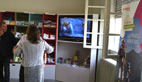 L’écran géant qui présente de courtes vidéos sur le territoire fait face à la maquette du PNR en relief, outil de médiation pour orienter le visiteur entre les différentes maisons de parc. Car bien entendu il s’agit de mettre en valeur et donner envie de prolonger la découverte une fois sorti des locaux.