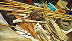 Apprendre à se projeter dans cette époqueÀ l’étage sous les combles, des lampes à huile et des torches sont prêtes à fonctionner. Des pigments pour la peinture, des tendons, de la vannerie, une petite bourse en peau de lapin, des petites rondelles en omoplate de bison, des propulseurs, des sagaies… et des pelotes de lanières indispensables pour monter et attacher les tentes du campement: «on peut également faire des liens en fibre de tilleul, indique Emmanuel, ce sont des cordelettes de très bonne qualité, mais c’est plus long.