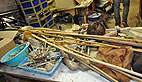 Et pour cela rien n’est laissé au hasard. Emmanuel a rempli un congélateur d’os de bisons récupérés auprès de la ferme aux Bisons de Lapenne: «le propriétaire de cette ferme animalière nous a procuré un daim de son élevage qui servira à notre tribu au retour de la chasse», poursuit Emmanuel qui nous conduit dans un dédale dans sa caverne d’Ali Baba. Sur une table des patrons pour confectionner des chaussures en cuir qui s’adaptent à la forme du pied: «il faut penser à toutes les pointures, là c’est du 30 pour un enfant, mais nous avons également des sacs, des tranoirs, ancêtres de nos sacs à dos, des parures en cuir et coquillage, des vêtements en peau, en fourrure»