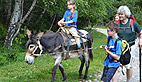 À plus de 1.100m d’altitude, Reyou et Jojo, deux ânes mis à disposition par un éleveur de chèvre du coin, conduisent nonchalamment Kadosa et sa nombreuse famille et offrent même leur dos aux plus jeunes d’entre les enfants. Leur arrivée ici est déjà une histoire en soi. Venus participer à une compétition d’aviron à Libourne cette famille belge, d’origine hongroise, a souhaité agrémenter son séjour d’une découverte de la montagne. Quelques clics suffisent pour les amener à choisir la prestation offerte par Oxalys.