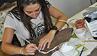 A quelques jours du Préhisto’loft saison 2, les petites mains d’activent e coulisse notamment pour donner une dimension artistique aux vêtements. Audrey, archéologue de formation, mélange les pigments qui serviront à décorer les vêtements de peau, un dispositif de rouge et de blanc, complétant les parures en petits coquillages décoratifs sur les manches et le col.