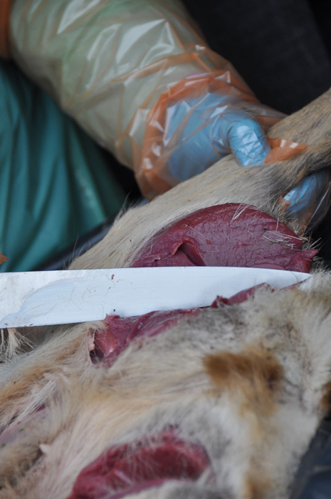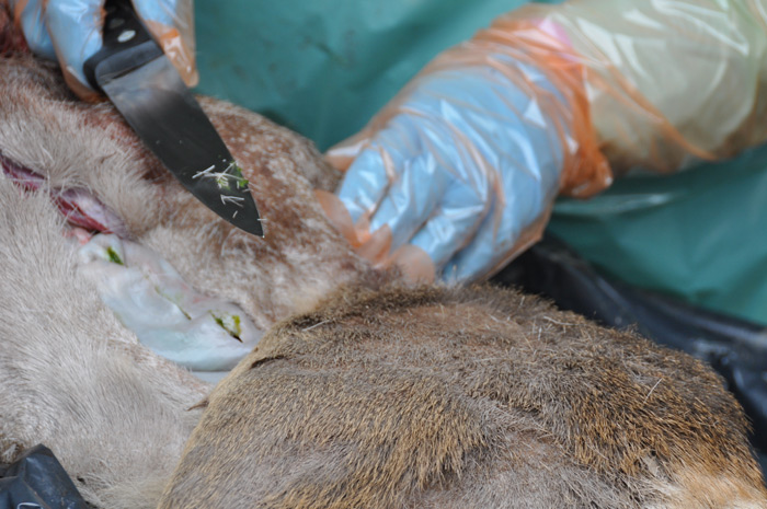 Mais le chasseur quand il a récupéré cette bête, s’est rendu compte qu’elle était anormalement maigre, qu’elle avait perdu beaucoup de poils et qu’elle avait des mélanomes. Autant de paramètres qui mettent la puce à l’oreille aux chasseurs formés à l’examen initial du gibier» explique le Dt Alzieu bien décidé à réaliser une autopsie pour déterminer précisément les causes d’affaiblissement anormal de cet animal.