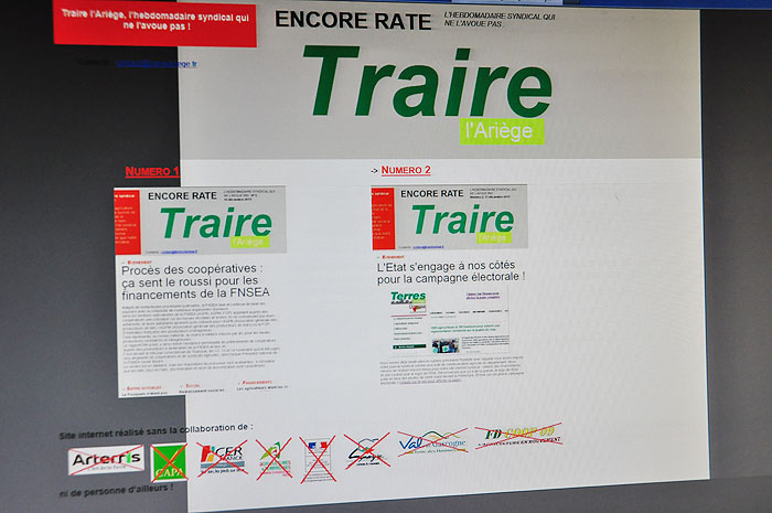 En effet l’adresse www.terresdariege.fr renvoyait sur une page intitulée «Traire l’Ariège», ressemblant à s’y méprendre au journal du syndicat majoritaire: même composition, couleurs identiques et titres reprenant l’actualité de la Chambre d’Agriculture.