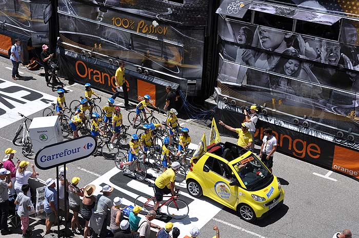 A quelques heures de l’arrivée, de jeunes cyclistes équipés par une marque de boisson chocolatée vont prendre le départ pour une épreuve originale.