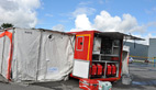 Une berce de décontamination est installée sur site, il s’agit là d’un matériel deuxième génération doté de systèmes de cabines douches pouvant accueillir des victimes invalides sur brancards, capable de traiter 40 personnes à l’heure.