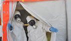 Des dizaines de pompiers en combinaison interviennent sur les lieux de la catastropheDe part et d’autre la zone interdite on s’active, distribution de kits d’intervention et de combinaisons étanches, chacun est dans son rôle plus vrai que nature.