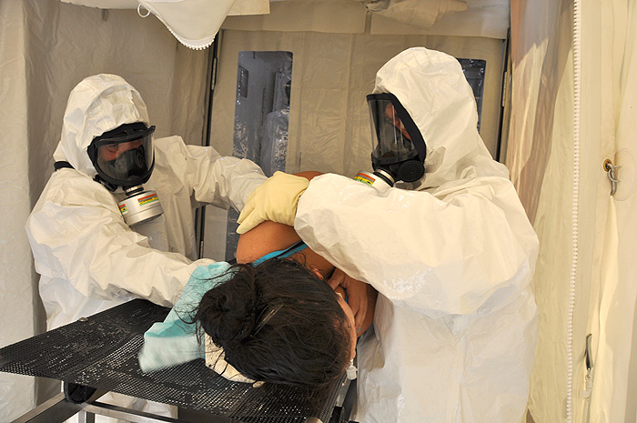 «C’est une situation très exceptionnelle, les enjeux d’un tel exercice reposent sur la mutualisation des ressources et pour arriver à être efficaces, il faut s’entraîner, mesurer les écarts entre les procédures et ce qu’on attend, revoir le matériel pour simplifier les procédures… on évacue les victimes, on fixe la contamination en les poudrant avec un talc à base de terre de foulon. Dans un deuxième temps elles seront transportées sur la chaîne de décontamination pour une décontamination humide»