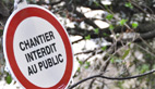 Une demi-douzaine d’hommes en rouge de l’entreprise CAN spécialisée dans les travaux dangereux, évoluent à plus de 60 mètres sur la falaise qui surplombe le rond-point de l’hippodrome. Ces spécialistes de travaux de cordes consolident la paroi rocheuse. Le matériel nécessaire à cette intervention a été héliporté sur site et l’installation d’un pare bloc sur le pied du versant vient de débuter.
