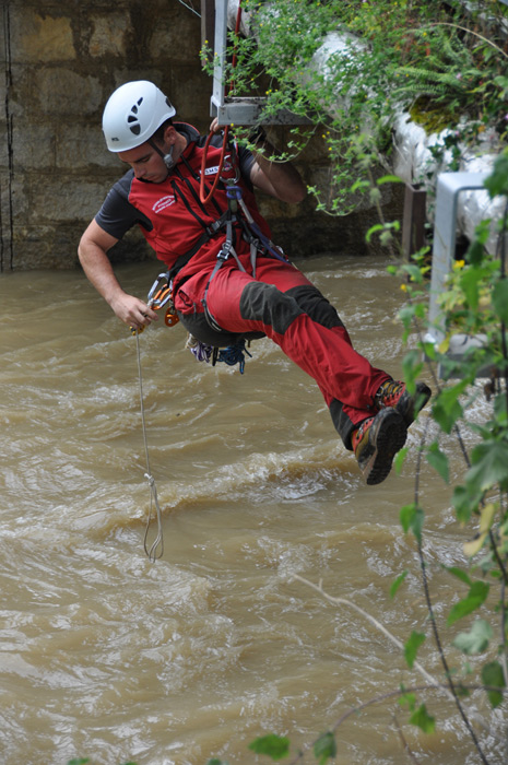 En début d'après midi les hommes du GRIMP (groupe d'intervention et de reconnaissance en milieux périlleux) harnachées dans le vide au dessus de la rivière sont intervenus pour dégager les ouvrages d'encombrants déchets : poutres, arbres entiers, bidons.