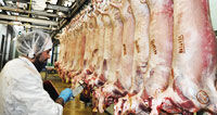 On enlève par la suite les viscères et le cuir, tout ce qui est sale au fur et à mesure que la carcasse avance sur la chaîne, puis il y a un contrôle post-mortem réalisé par le vétérinaire»