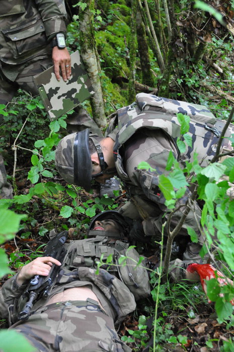 L’adjudant-chef Bonnet est arbitre/contrôleur, il accompagne un exercice de destruction par embuscade sur un ennemi. Un véhicule motorisé a attaqué les troupes amies et l’opération s’est soldée par un blessé dans les rangs amis. Très vite les hommes procèdent aux premiers secours sur le blessé: pose d’un garrot, injection de morphine, rédaction des différents messages pour informer de la position et mise en relation avec le médecin de l’unité, enfin intervention de l’hélicoptère pour une prise en charge rapide de la victime:
