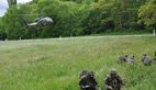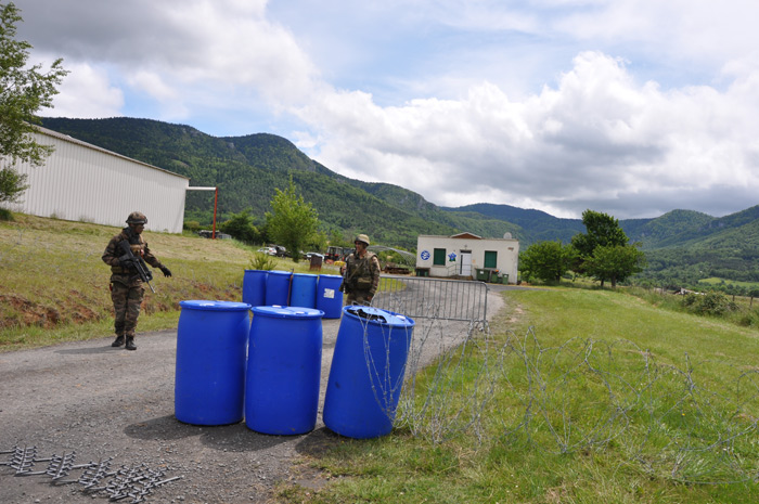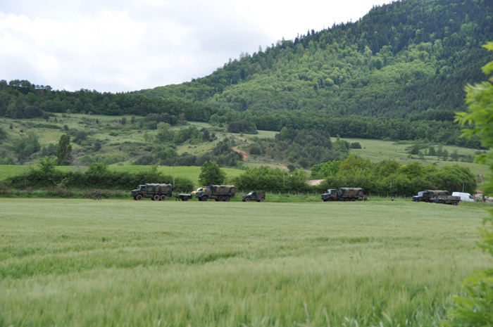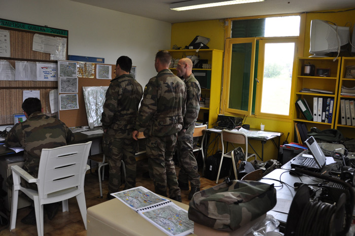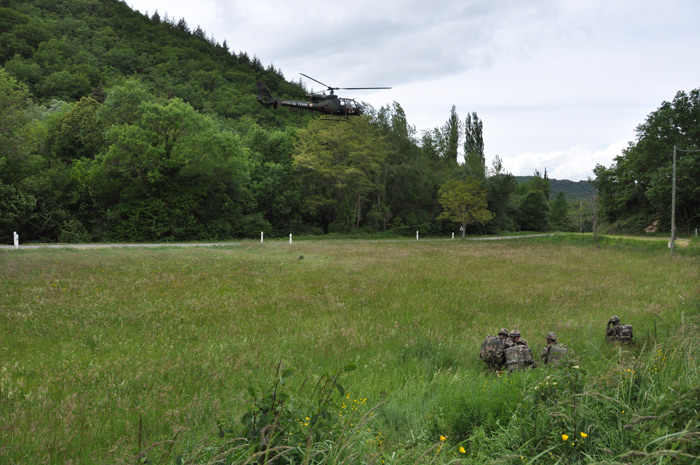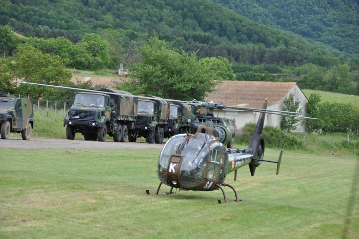Autour de l’hélicoptère du 5ème Régiment d’Hélicoptère de Combat de Pau (5ème RHC), le régiment ariégeois a disposé son matériel sur zone (camions, VAB, missiles, mortiers de 80…) et du quartier général installé dans le petit aérodrome, les officiers de l’Etat major suivent sur les cartes la progression de chaque Cie et de chaque section, vérifiant si elles ont accompli les missions, leur fournissant si besoin, l’appui de l’hélico ou leur envoyant des instructeurs pour les tester.