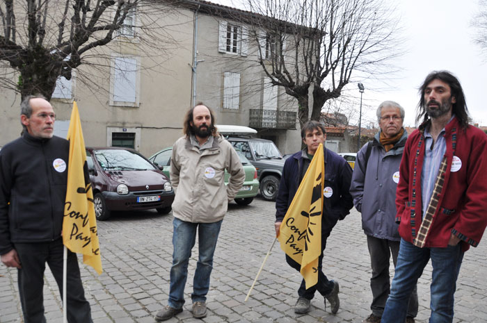 C’est devant le palais de justice de Foix que David Huez et ses camarades de la Confédération Paysanne ont tenu un point presse cet après-midi après avoir pris connaissance du jugement rendu dans l’affaire qui les oppose à la FDSEA09 pour avoir usurpé la marque du journal «Terres d’Ariège»