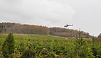 Ce mardi on assistait à un curieux ballet au-dessus de sa plantation: un hélicoptère assurait des rotations avec à l’extrémité de son câble, à chaque voyage, une centaine de sapins de Noël.