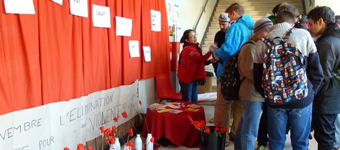 Un visuel émouvant, explicite et artistique, en rouge et blanc, pour sensibiliser le public, a permis tout au long de cette journée des échanges très riches avec des parents, donc des hommes et des femmes, des jeunes enfants et des adolescents.