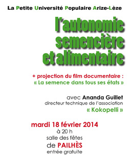 Ananda Guillet, directeur technique de l’association Kokopelli, présentera un film documentaire d’une trentaine de minutes intitulé «La semence dans tous ses états», puis traitera de «L’autonomie semencière et alimentaire»