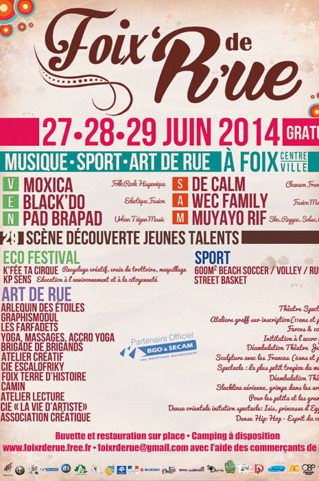 Festival gratuitCe festival est entièrement gratuit, grâce aux nombreux partenaires institutionnels, commerçants, mairie de Foix… et les organisateurs comptent sur la participation de tous grâce au stand restauration et à la buvette qui proposeront des bières ariégeoises, des menus à petit prix mais composés à partir de viandes et produits locaux et de circuits courts, dans la démarche éco-citoyenne de l’ensemble du festival.