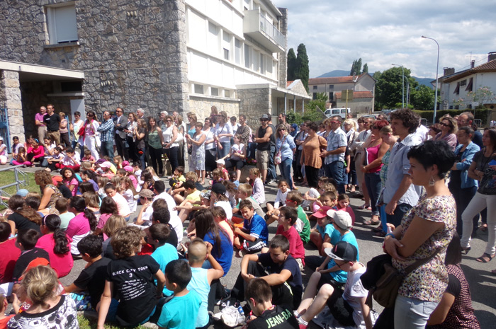 Les plaques furent ensuite dévoilées au nombreux public présent. Celle de la devise républicaine a été réalisée par les jeunes du Fajip de Foix et le Centre de Formation aux Métiers (voir notre article du 7/05/2014) et tout le monde s’est retrouvé autour d’un verre de l’amitié dans la cour de l’école.