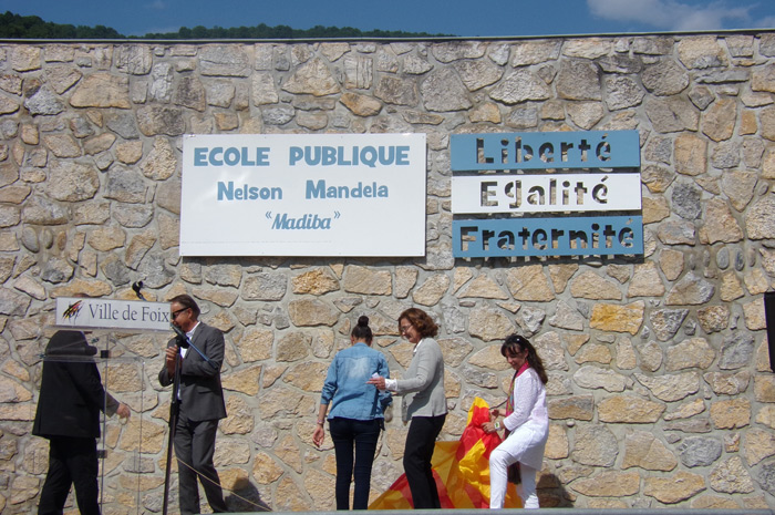 Dans son court discours d’introduction le Maire de Foix précise que la devise républicaine est régulièrement apposée au fronton des écoles. Le choix de rendre hommage à Nelson Mandela vient d’une proposition de Nathalie Loze (élue «Vraiment à Gauche») étudiée en conseil municipal et qui fut votée. Le Conseil de l’école du Courbet a ensuite accepté cette proposition.