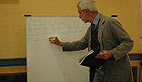 Yvon Blazy marquant avec attention les ponctuations, répétant les mots ou expressions difficiles.