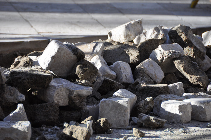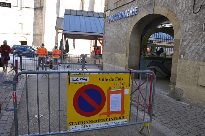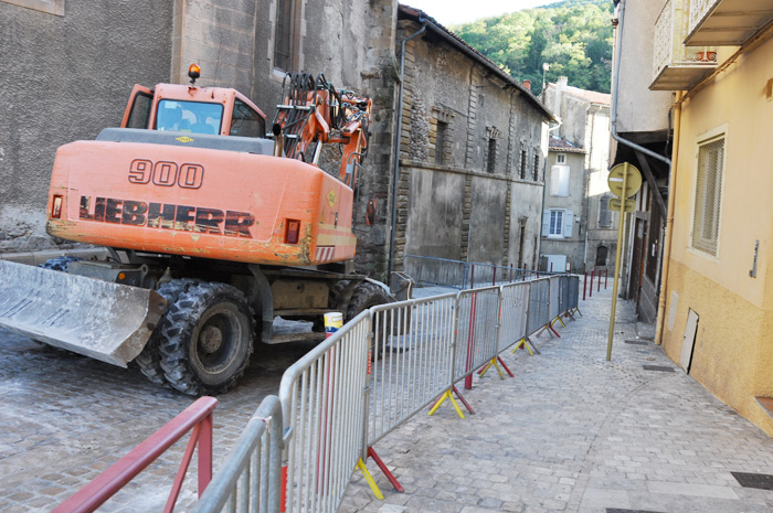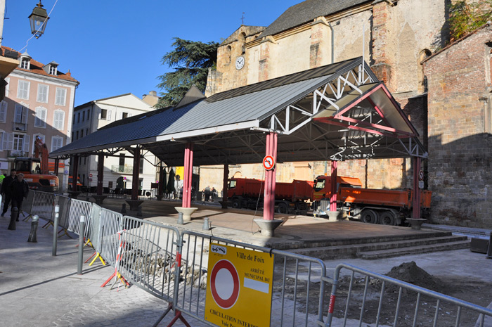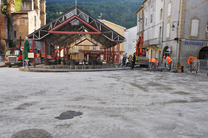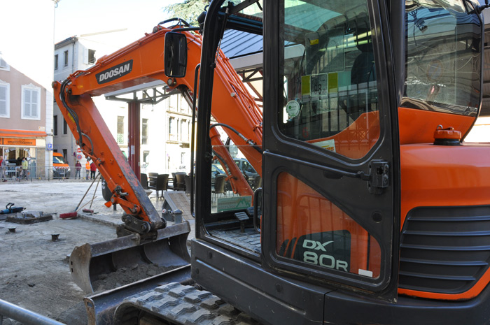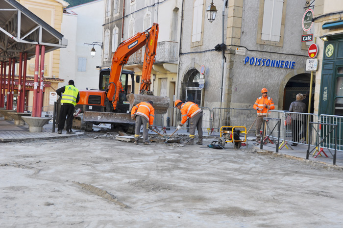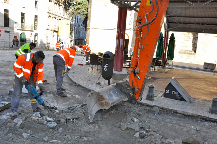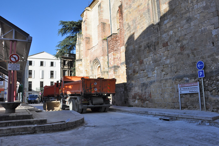 Sur la place des camions, des pelles-araignées et des marteaux-piqueurs attaquent le revêtement de pavés, devenu dangereux pour les piétons avec le temps: «il était urgent d’intervenir sur cette place Saint-Volusien», précise Alain Navarro adjoint au maire en charge des travaux à la mairie de Foix.