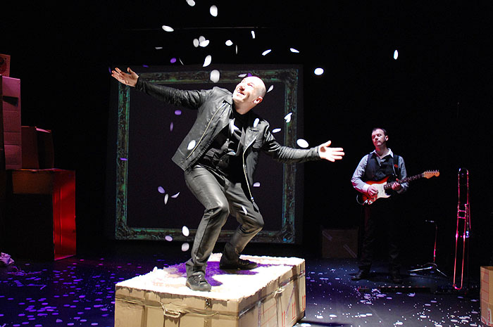 Voilà Hervé Suhubiette tour à tour fragile, en colère, amoureux, mélancolique, joyeux, devant un miroir, dans des cartons de souvenirs ou sur un petit vélo pour voyager au gré de ses humeurs.