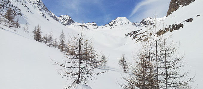 Décidément, je ne parvenais pas à m’engager sur un secteur aux traces si abondantes. J’allais presque renoncer à aérer les skis lorsqu’apparut sur ma droite un vallon aussi discret qu’attirant, s’enfonçant au-dessus de quelques chalets et d’un bois de Mélèzes vers l’ouest.