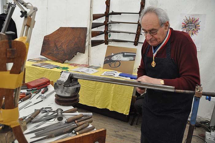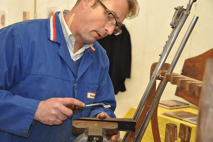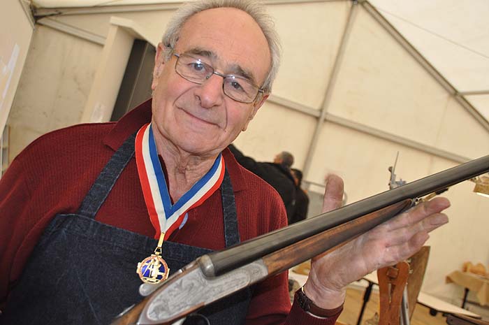 C’est avec bonheur qu’il réalise pendant trois jours des démonstrations devant le public: façonnage de pontet, gravure… «Je ne fabrique que 5 à 6 armes par an. Autrefois tous les fusils étaient réalisés à la main, à présent ils sont entièrement redessinés pour être fabriqués à la machine. Les armes que je fabrique sont destinées à une clientèle particulière de ma région, des chasseurs de bécasses, un gibier noble»