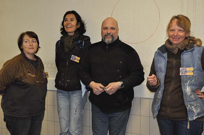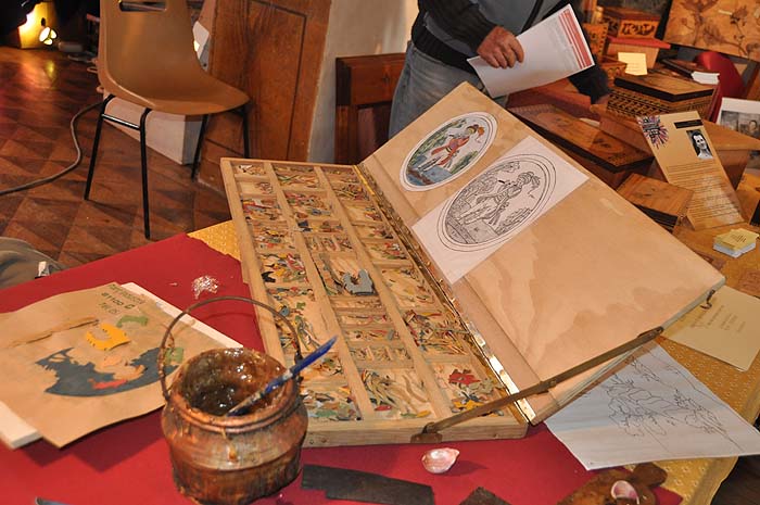 Le thème national de ces JEMA est «les métiers se mettent en scène»; aussi Gérard Roux de la CMA de Foix a demandé à Guy Sahuc, peintre décorateur ornemaniste, de diriger une œuvre collective avec trois autres artisans d’art du PNR: Muriel Andrin de Lescure, Sandrine Bouvier du Volvestre et Chloé Preteceille du Séronais.