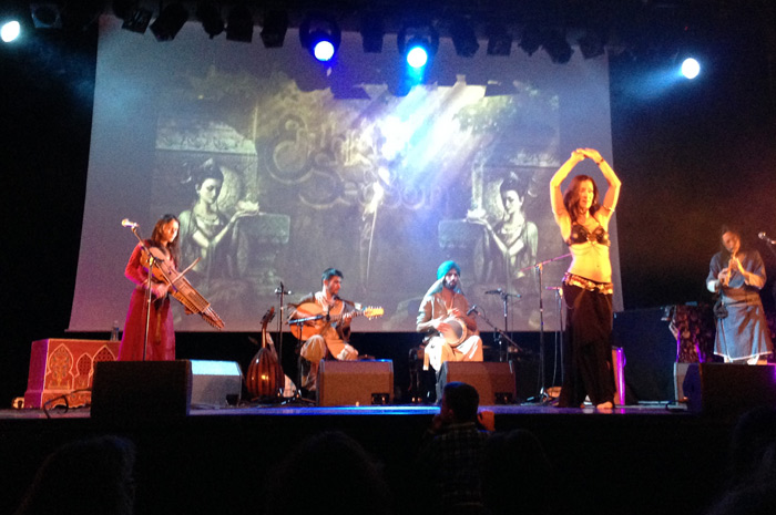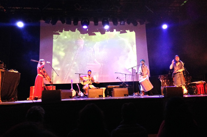 Très bon début de soirée grâce au groupe Dayazell composé de quatre musiciens (trois garçons et une fille) qui nous a proposé une musique métissée, aux accents arabo andalou, perses, arméniens ou mongols jouée sur des instruments traditionnels. Le son typique des cordes du oud (sorte de guitare turque) soutenu par la nyckeharpa (un violoncelle suédois) de Isao Bredel et sa voix envoutante nous ont fait voyagé à travers l’orient. Flutes mélodieuses et tonique darbouka accompagnaient l’ensemble.