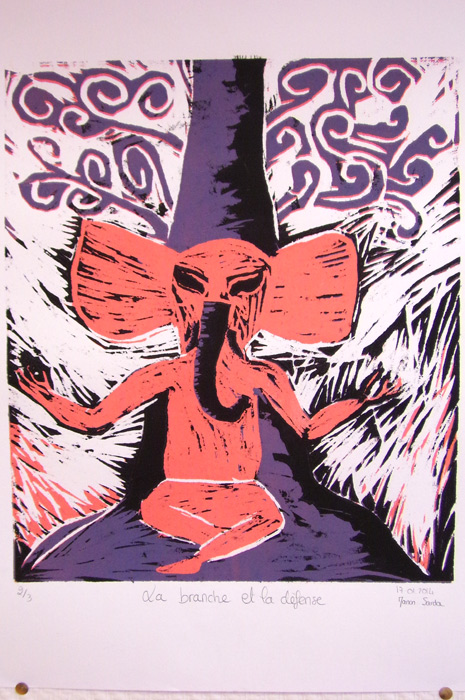 Chaque élève a interprété librement ce thème commençant par un dessin préparatoire. La technique ensuite utilisée est celle de la plaque perdue où la même plaque de bois est gravée plusieurs fois à l’aide de gouges correspondant à une gravure par couleur.