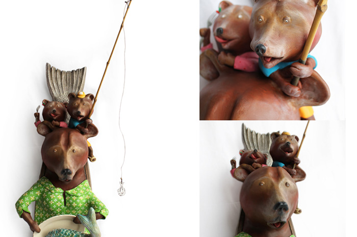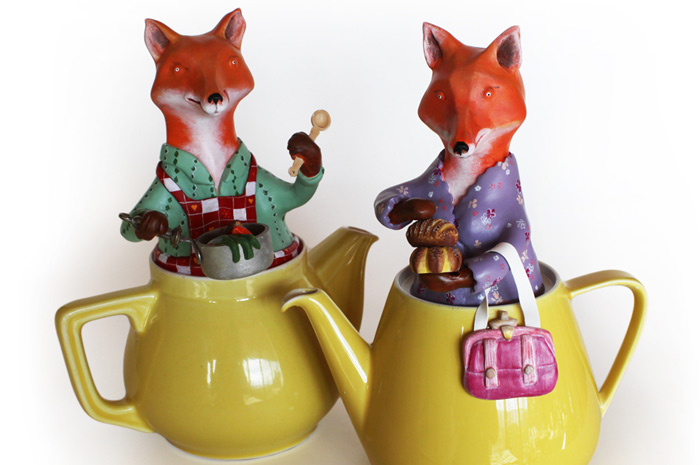 Détournant des objets du quotidien, souvent de la vaisselle, elle y modèle en pâte à bois des animaux en habits du dimanche qui prennent la pause. Un joyeux bestiaire: à chacun son histoire courte, ludique et profondément poétique.