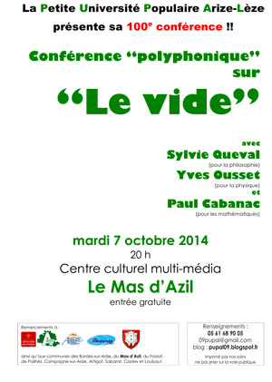 La prochaine séance, qui aura lieu le mardi 7 octobre, à 20 h, au Centre culturel multimédia du Mas d’Azil, sera consacrée à une «conférence polyphonique sur le vide», avec Sylvie Queval (philosophie), Yves Ousset (physique) et Paul Cabanac (mathématiques).