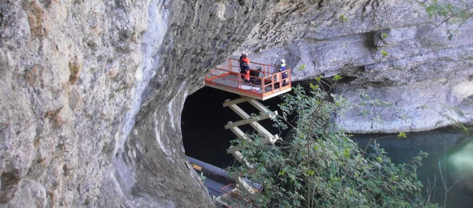 Les techniciens spécialisés interviennent donc actuellement sur le plafond de la grotte, à l’aplomb de la route, à des hauteurs variant entre 4,20 et 30 mètres au point le plus haut. Ils profiteront de cette
