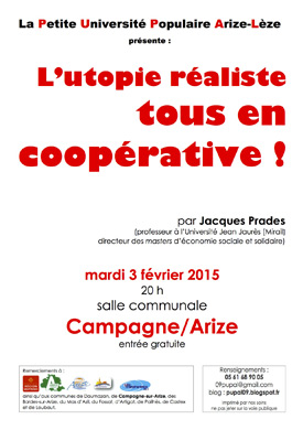 La prochaine séance de la PUPAL aura lieu mardi 3 février, à 20 heures, dans la salle communale de Campagne-sur-Arize: Jacques Prades, maître de conférences en économie à l’Université Toulouse-Jean Jaurès, y traitera de «L’utopie réaliste: tous en coopérative !».