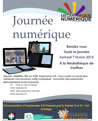 Il y a bien longtemps que ce service culturel intercommunal est connecté mais pour aider les habitants du Varilhes à découvrir les arcanes de l'informatique, la médiathèque organise samedi 7 février une journée numérique avec des ateliers, des démonstrations, des échanges Liseuses, tablettes, film en VOD, imprimante 3 D... seront mis à disposition pour mieux manipuler ces nouveaux outils numériques et rencontrer des passionnés:
