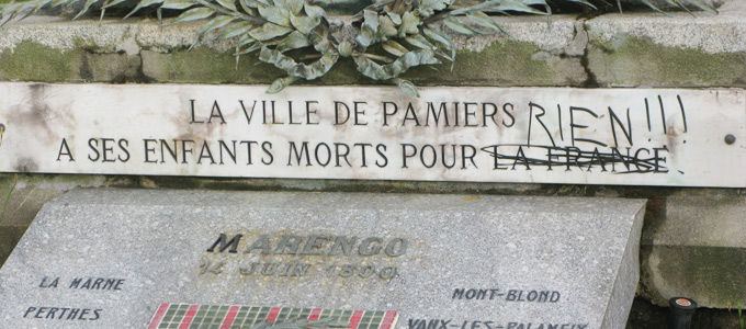 Un tag assez dérangeant sur le monument aux morts de Pamiers a été découvert mardi soir par Michel Astié, président du comité de liaison des anciens combattants du canton de Pamiers.
