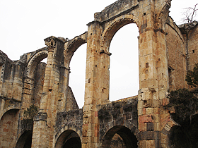 La moitié gauche de la nef est la plus complète, elle a effectivement conservé son collatéral avec ses grandes arcades et la tribune qui les surmontent, le tout éclairé par de vastes fenêtres en plein cintre.