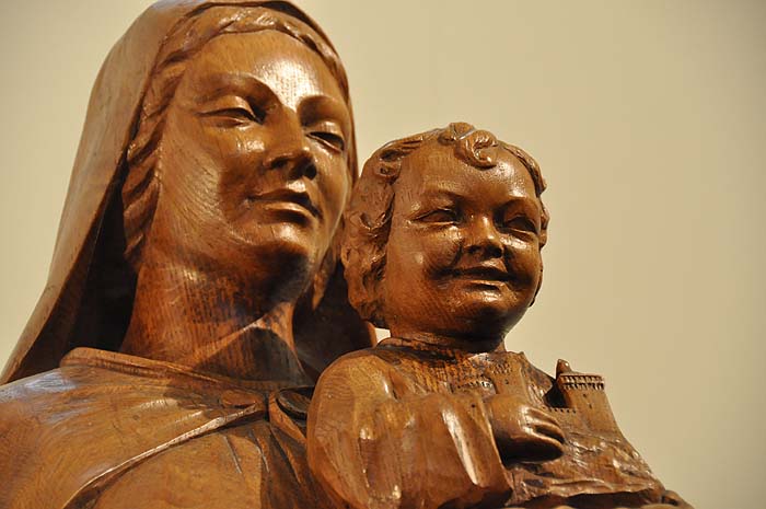 Sur le modèle d’une sculpture disparue de l’église, M. Saurat de Montels en exécute une nouvelle, toujours visible aujourd’hui, d’une grande précision. Elle représente l’enfant Jésus tenant dans ses bras une exquise miniature des tours du château de Foix porté par la Vierge. Cette œuvre symbolise la protection de la Vierge sur la ville.