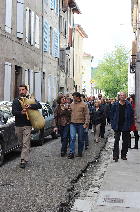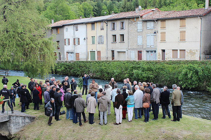 Ensuite, telle une procession, le groupe s’est engouffré dans les rues de Bélesta guidé par le son de la cornemuse pour assister à la présentation du second panneau situé sur un îlot au bord de l’Hers.