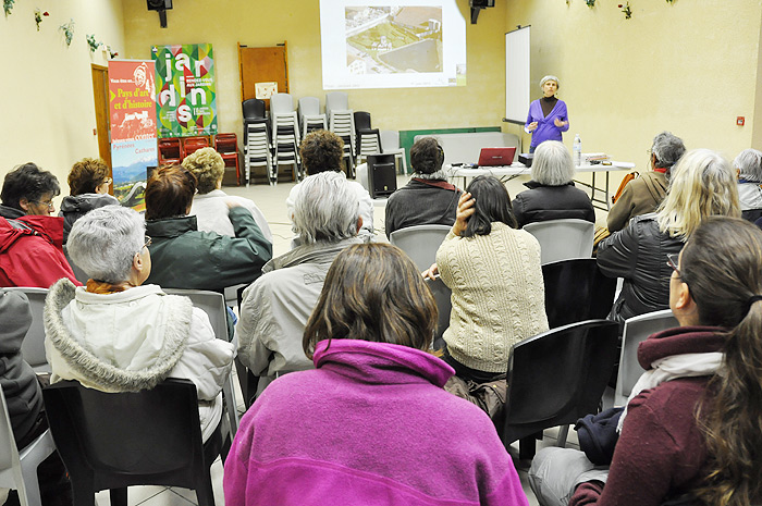 Après avoir arpenté les allées c'est dans la salle des fêtes du village que la visite s'est poursuivie avec une projection puis la présentation d'un film par Sylvie Assassin, architecte paysagiste de l'Agence Architecture et Patrimoine à Lavelanet.