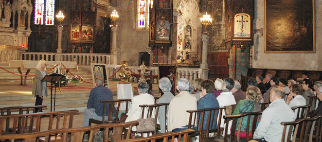 «Afin que les choses aient du lien», Martine Rouche avait invité son public, le jour de la fête Saint Maurice à Mirepoix. «Une bonne façon d'introduire le sujet et d'inviter le public à lever les yeux sur les vitraux, la grande icone ou à découvrir la relique de Saint Maurice, relique datant du 17ème siècle et offerte à la paroisse par l'évêque de Lévis»